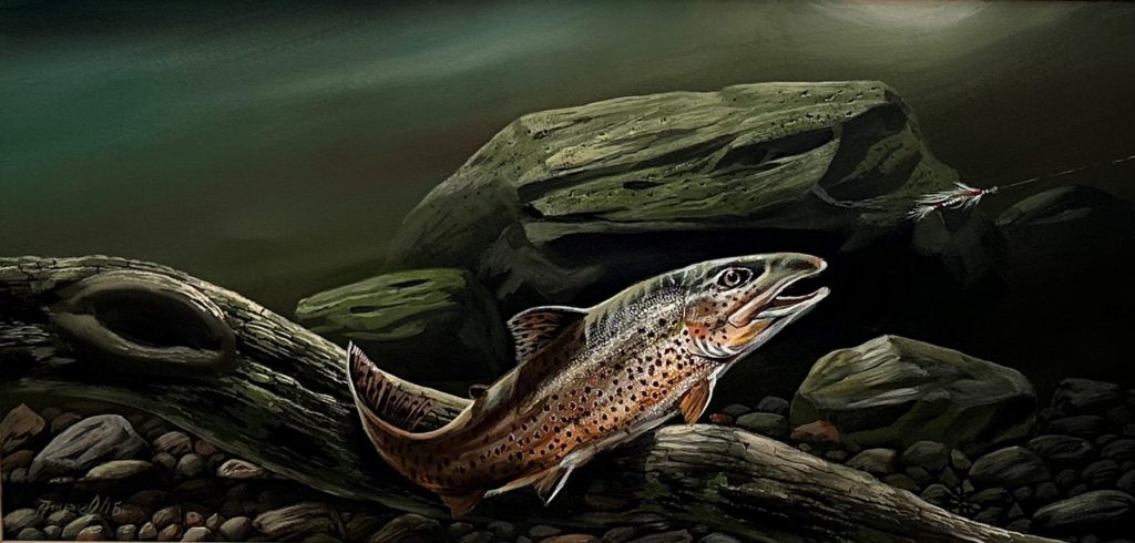 Gary Ampel Brown Trout on Log 15″ x 30″ Acrylic on Canvas